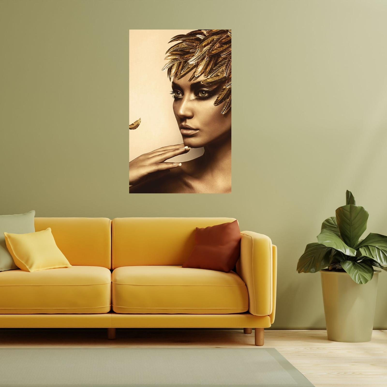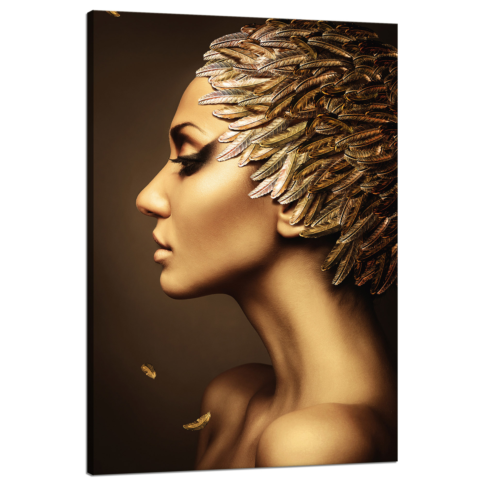 Obraz na plátně Pensive Woman Golden Colors Peří 80x120 cm